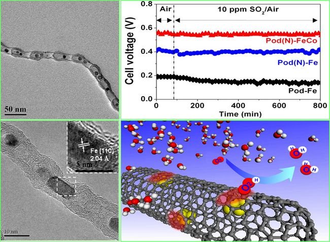 實驗和理論研究進一步證實,在這一體系中,包裹納米金屬鐵的碳壁阻斷了反應氣體與鐵納米粒子的直接接觸,從原理上避免了反應過程中活性金屬鐵納米粒子的深度氧化,以及反應氣氛中其它有害組分對催化劑的中毒,從而在根本上解決了納米金屬鐵作為燃料電池陰極催化劑的穩定性難題。進一步對包裹金屬納米粒子的碳壁進行雜原子(如氮原子)摻雜和改變包裹其中的金屬納米粒子組分,對電極材料的催化性能起到明顯的調變作用。當碳納米管管壁氮摻雜濃度為3.3 wt%,包裹Fe-Co納米合金時,在完全相同的操作條件下,電池的功率密度可以達到以20%Pt-C催化劑的60%。特別是,在10 ppm的有害成分硫(SO2)存在時,電池仍保持了優異的活性和穩定性。這一結果近期被《德國應用化學》在線發表。