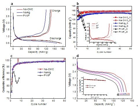 圖1. Li4Ti5O12作為鈉離子電池負極材料的充放電曲線(a),循環性能(b),庫侖效率(c)和全電池(Na3V2(PO4)3正極/ Li4Ti5O12負極)性能(d)。