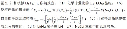 與Li嵌入Li3[LiTi5]O12僅形成單一的Li6[LiTi5]O12(Li7Ti5O12)不同(Li3[LiTi5]O12 + 3Li ↔ Li6[LiTi5]O12),隨著Na的嵌入,同時有兩個新相Li6[LiTi5]O12與Na6[LiTi5]O12生成。三相分離是熱力學有利的,而動力學計算顯示鈉離子擴散速率要比鋰離子慢很多,由此我們可以畫出如圖3所示的脫嵌鈉反應機理。但反應相與兩個新相之間如何形成界面結構,不易預測和模擬。