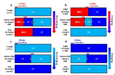 圖3. Li4Ti5O12嵌鈉的三相反應模型(a,b)及嵌鋰的兩相反應模型(c,d)。