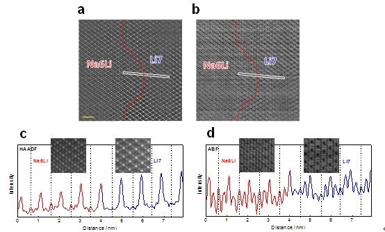 圖5. 3 mol Na 嵌入1 mol Li4Ti5O12納米顆粒的高分辨掃描透射電鏡成像。(a)HAADF圖像;(b)ABF圖像;(c)圖a相邊界對應的線掃描襯度;(d)圖b相邊界對應的線掃描襯度。