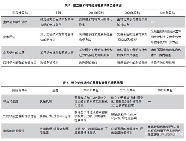 該部分主要包括生物動力學和轉(zhuǎn)移、危害評估、危害受體的狀況、工程納米材料、以科學為基礎的監(jiān)管方法等領域,具體路線圖見表3。生物動力學和轉(zhuǎn)移領域的主要目標是了解納米材料的生物動力學特征和轉(zhuǎn)移的情況;危害評估的主要目標是確定評估的方法;危害受體狀況的主要目標是確定易感人群;以科學為基礎的監(jiān)管方法領域的主要目標是確定納米危害測試的模型。