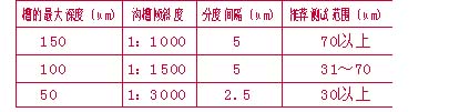 GB/T 1724-1979(1989)中規定的國際刮板細度計由工具金鋼(牌號Cr12)的磨光平板制成,板上的楔形溝槽長155mm±0.5mm、寬12mm±0.2mm,依據不同規格的測定范圍,在150mm長度內分別刻有0~150μm、0~100μm、0~50μm的表示槽深的等分刻度線,其分度、溝槽傾斜度和推薦測試范圍如表1所示。三種規格細度計的正面槽底及反面平直度允許差0.003mm /全長,正面光潔度為10,分度值誤差為±0.001mm。刮刀則是由優質工具碳素鋼(牌號T10A)制成,長為60mm±0.5mm、寬42mm±0.5mm,兩面刀刃均需磨光,刀刃平直度允許差0.002mm /全長,表面光潔度為8,刀刃研磨光潔度為10。