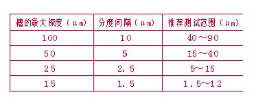 GB/T 6753.1-1986中規定有100μm、50μm、25μm和15μm四種規格的國際標準刮板細度計,均由長約175mm、寬65 mm、厚13mm經淬火的磨光鋼板制成,其表面開有一條或兩條長約140mm、寬12.5mm的楔形溝槽,這類國際刮板細度計的分度和推薦測試細度范圍如表2所示。刮刀由長約90 mm、寬40mm、厚6mm的雙刃鋼片制成。