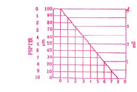 國產的刮板細度計以微米(μm)表示被測試樣的研磨細度,如圖1所示。國外的細度計也有采用密耳(mil)(1mil=25.4μm)、海格曼(Hegmann)等級(0~8級)和FSPT規格(0~10級)來表示的,它們的換算關系如圖2所示。
