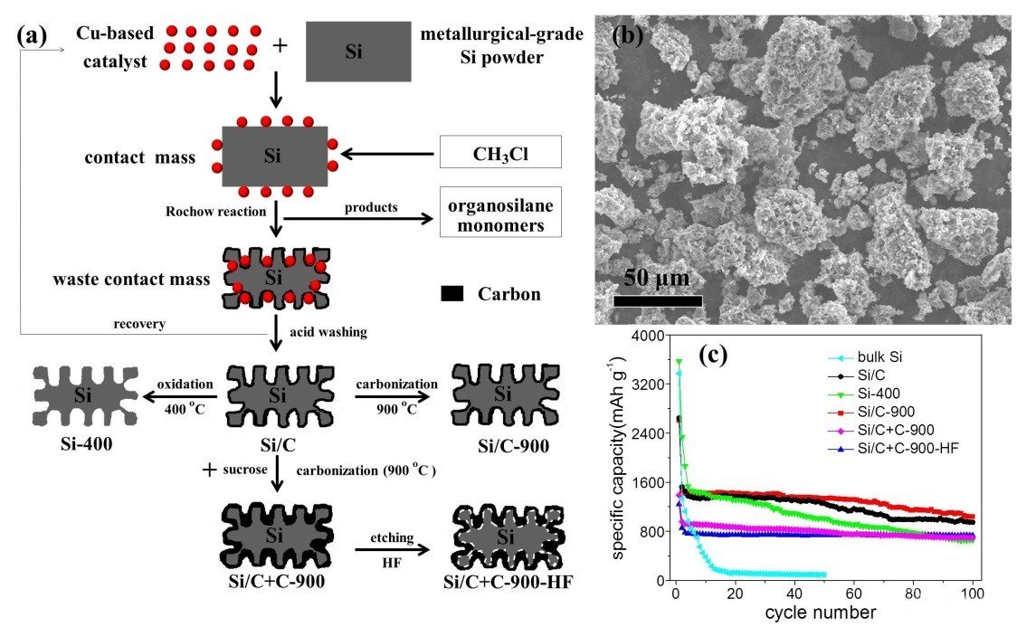 他們借鑒有機(jī)硅單體合成工業(yè)過程,以工業(yè)硅粉和氯甲烷為原料,通過有機(jī)硅行業(yè)廣泛使用的Rochow反應(yīng),利用多種銅基催化劑在溫和條件下制備出多孔硅/碳復(fù)合材料,通過簡單后處理工藝得到硅/碳復(fù)合負(fù)極材料。電化學(xué)測試表明,在循環(huán)100周之后仍然保持了1000mAh/g左右的容量。同時(shí)制備過程中副產(chǎn)的多種有機(jī)硅單體可作為有機(jī)硅材料的原料,銅催化劑可回收利用。目前我國有機(jī)硅單體產(chǎn)量每年約200萬噸,消耗的硅粉原料約50萬噸。若將有機(jī)硅單體生產(chǎn)過程設(shè)備與多孔硅材料的制備相結(jié)合,控制合適的生產(chǎn)工藝條件,將有望解決多孔硅/碳復(fù)合負(fù)極材料的低成本規(guī)模化制備的問題。該制備工藝過程和負(fù)極材料已獲得發(fā)明專利授權(quán)(利用硅與鹵代烴催化反應(yīng)制備多孔硅材料的方法,ZL201010146666.X;一種鋰離子電池硅基負(fù)極復(fù)合材料及其制備方法,ZL201110268147.5)。
