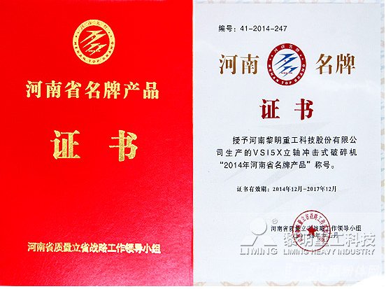 羊年伊始,VSI5X斗志昂揚,斬獲河南省名牌產(chǎn)品稱號,這是黎明重工首個榮膺該獎項的產(chǎn)品,也是繼2014年摘得河南省科技進步三等獎與上海寶馬展首筆訂單后,又一次憑借硬實力成為眾人矚目的焦點。