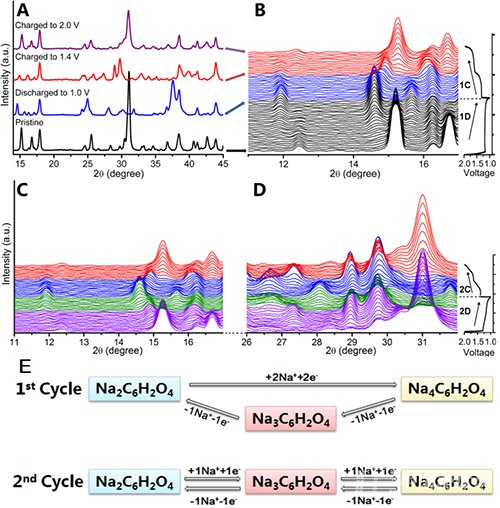 圖3 Na2C6H2O4前兩周嵌鈉過程的原位XRD圖譜及反應路徑示意圖