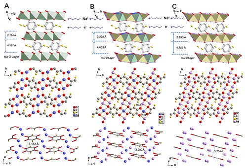 進一步和A02組副研究員金士鋒、研究員陳小龍合作,解析出Na2C6H2O4及其嵌鈉態Na3C6H2O4和Na4C6H2O4的晶體結構,發現它們的結構是由互相平行的有機苯環層和無機Na-O層交錯堆疊而成的有機-無機層狀結構。原位XRD結果顯示,在前兩周充放電中的結構變化為:首周放電發生Na2→Na4的兩相反應,首周充電中則依次發生Na4→Na3和Na3→Na2兩個兩相反應過程;在第二周的放電和充電過程中均出現中間相Na3相。隨著Na的嵌入,Na原子和羰基的配位情況發生了變化,Na3相的Na-O層相比于Na2相和Na4相發生了一定程度的扭曲,同時苯環與bc平面之間的夾角減小,整個分子發生轉動。結合第一性原理計算,E01組博士生章志珍等研究了Na2C6H2O4材料及其嵌鈉態Na3C6H2O4和Na4C6H2O4的電子結構及鈉離子傳輸機制。發現電子在有機苯環層內傳遞和存儲,苯環為氧化還原中心;而鈉離子在無機Na-O層中擴散和存儲,這個新的機制類似于過渡金屬層狀氧化物材料。這對于設計新型的有機材料提供了理論指導。相關研究結果得到國際同行的高度認可,最近發表在Science子刊Science Advances 2015, 1, e1500330。