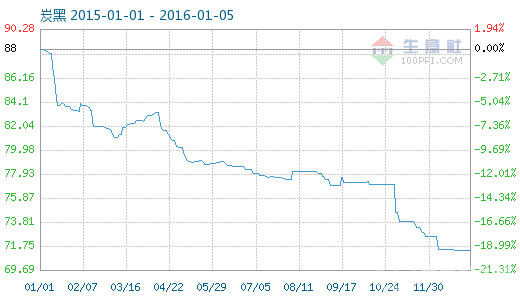 通過生意社商品價格指數來看,2015年初炭黑商品價格指數為88,2015年末炭黑商品指數為71.75,下跌了18.99%。