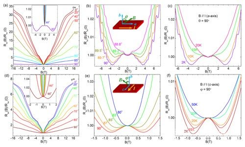 在低溫下,當(dāng)電流與磁場(chǎng)平行時(shí),出現(xiàn)負(fù)磁阻行為。而磁場(chǎng)偏離電流方向時(shí),或者溫度升高時(shí)負(fù)磁阻行為消失。