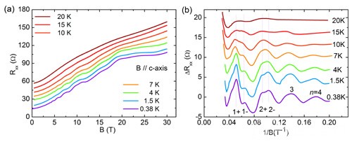 強(qiáng)磁場(chǎng)下的量子輸運(yùn)測(cè)試表明,由于電子的朗道能級(jí)劈裂,量子振蕩峰分裂為兩個(gè)峰。