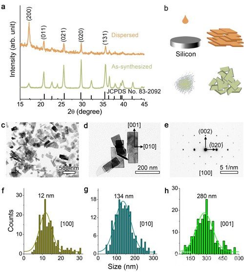 圖1(a)新合成的樣品和把樣品分散后再滴到非晶硅上的XRD圖譜。(b)圖a的示意圖。(c,d)LiFePO4的TEM圖。(e)對應(d)的電子衍射花樣。用高斯函數擬合LiFePO4晶粒沿著不同方向的尺寸統計數據。(f)a軸,12nm,(g)b軸,134nm,(h)c軸,280nm。