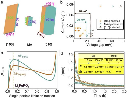 圖2(a)[100]取向,微波輔助合成以及[010]取向LiFePO4的形貌示意圖。(b)在不同的充放電電流下,從C/2到C/100,分別由[100]取向、微波輔助合成、[010]取向的LiFePO4構成的三種電極的電壓間隙。(c)在LiFePO4中Li化學勢相對于Li分數變化的函數關系,其中存在一個最大轉變勢壘(Δμb),定義為極大值和在不相混溶區中間的化學勢之差。(d)[100]取向和微波輔助合成LiFePO4電極的恒電位間隙滴定及其擬合實驗數據結果。