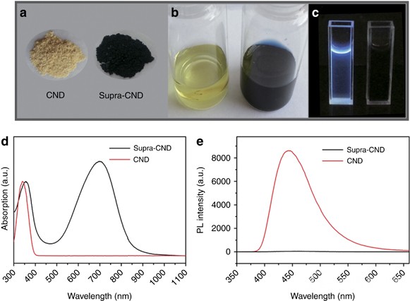 碳納米點組裝單元(左)和超碳納米點(右)的固體粉末(a)、溶液(b)以及紫外光照下(c)的光學照片;碳納米點組裝單元和超碳納米點的吸收光譜(d)和發(fā)射光譜(e)
