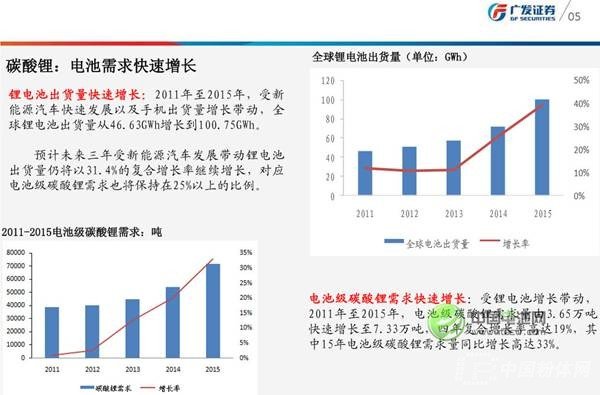 鋰電池出貨量快速增長:2011年至2015年,受新能源汽車快速發展以及手機出貨量增長帶動,全球鋰電池出貨量從46.63GWh增長到100.75GWh。預計未來三年受新能源汽車發展帶動鋰電池出貨量仍將以31.4%的復合增長率繼續增長,對應電池級碳酸鋰需求也將保持在25%以上的比例。