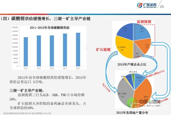 在儲量方面,全球鋰資源儲量共1350萬噸,儲采比378年,分布集中,智利、中國、阿根廷、澳大利亞四國儲量占全球99%。鹽湖提鋰三巨頭ALB、SQM、FMC占市場份額50%;礦石提鋰天齊控股的泰利森是全球龍頭,占全球供給的30%。巨國賢認為,2015年前全球碳酸鋰供給緩慢增長,供給總量17.3萬噸。但全球鋰資源并不缺乏,缺的是優質礦和優質鹽湖,缺的是低成本的產業化技術。