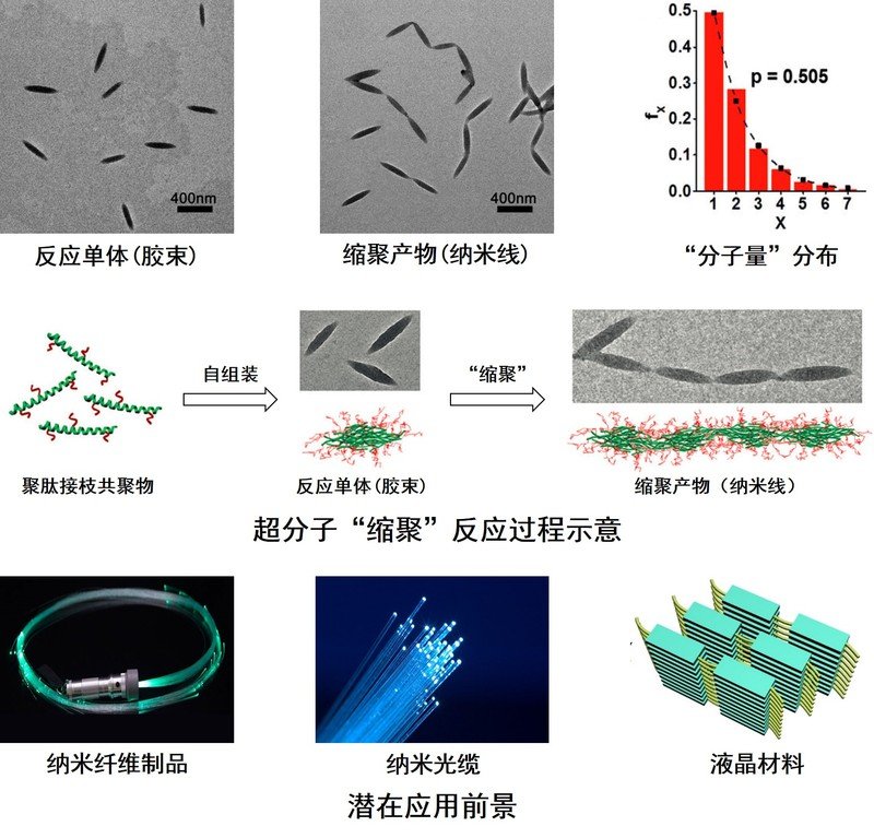 納米級的聚集體,如膠束等,通過特定的方法產生反應活性點后,可發生“縮聚”反應,形成納米線狀的鏈式超分子“聚合物”。這一發現提供了一種制備多級結構納米材料的新方法。該方法具有普適性和可控性,其意義在于將高分子縮聚反應的范疇擴展至納米尺度。研究表明,超分子“縮聚”反應并非局限于某一特定的聚合物,而是普適于多數含有剛性鏈段的共聚物系,“縮聚”得到的多級組裝體,其結構和尺寸具有可控性。因此,超分子“縮聚”反應展現出較為廣闊的應用前景,可用于精確制備具有多級結構的納米器件,提升功能性納米材料的尺度,如光電納米線、納米電纜和智能響應型載藥體等。通過該超分子“縮聚”反應,還有望制備各類超材料,如超強度液晶等,用于航空航天領域。