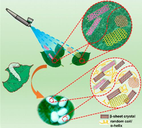 在實驗中,研究人員向蠶食用的桑葉上噴灑包含碳納米管或石墨烯的水溶液,然后收集蠶結繭產生的絲。他們測試后發現,加固后的絲的強度是普通絲的兩倍,在破裂前能承受的壓力至少比普通絲高50%,高溫加熱碳化后的絲還具有導電性。