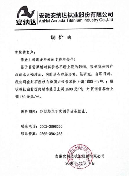 安徽安納達鈦業發布調價函,公司金紅石型鈦白粉國內銷售基價上調1000元/噸,銳鈦型鈦白粉國內銷售基價上調15000元/噸。外貿銷售基價上調150美元/噸。調價期限:從即日起至下次調價函生效止。