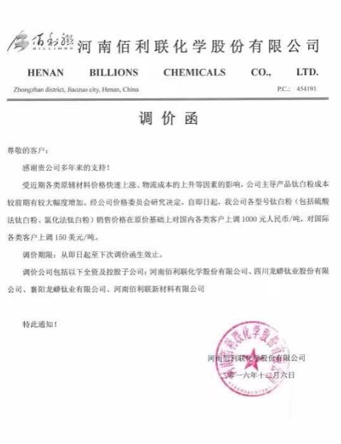 中國粉體網訊 12月6日,河南佰利聯發布調價函,公司各型號鈦白粉(硫酸法鈦白粉、氯化法鈦白粉)銷售價格在原價基礎上對國內各類客戶上調1000元/噸,對國際各類客戶上調150美元/噸。調價期限:從即日起至下次調價函生效止。