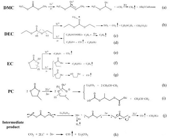 圖2 鈦酸鋰電池中各種電解質溶劑的分解機理。