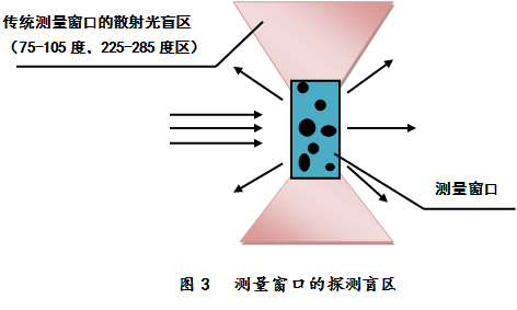無論是何種設計的激光粒度儀,都存在一個測量窗口,樣品在窗口中充分分散,被激光照射,產生散射光。如圖3所示,傳統測量窗口由于機械結構和光學玻璃存在全反射,總是存在一個散射光探測盲區。這個盲區大致分布在75-105度、255-285度區域內。