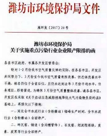 中國粉體網訊 日前,山東省濰坊市環保局發文,要求轄區內的炭黑企業全部停產。此次停產的時間為3月11日至3月31日,并視空氣質量改善情況適當延長(另行函告)。濰坊環保局同時要求,對沒有環保手續的企業,實施永久性停產。