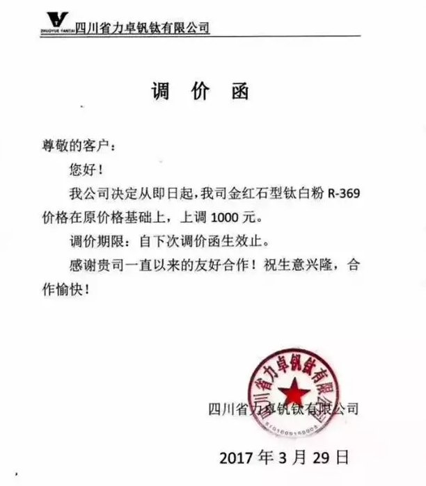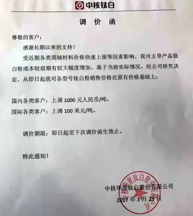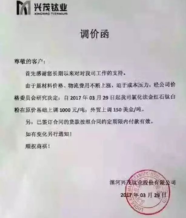 中核鈦白國內上調1000元/噸,外貿上調100美元/噸