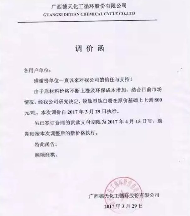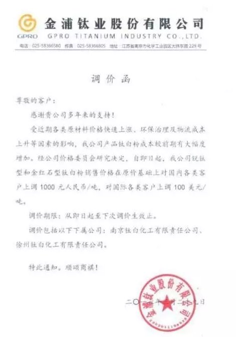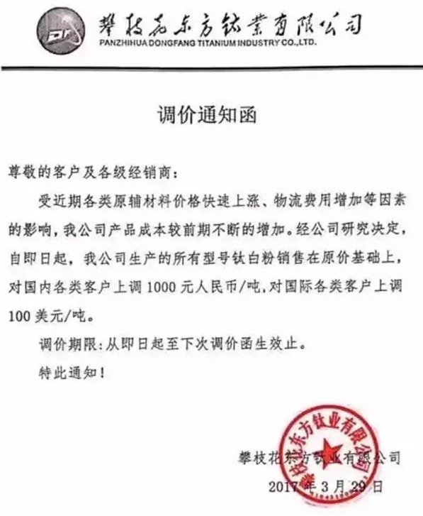 東佳集團鈦白國內上調1000元/噸,外貿上調100美元/噸