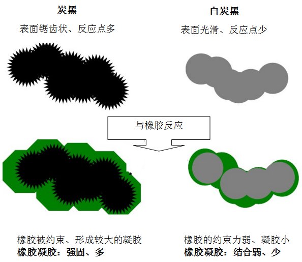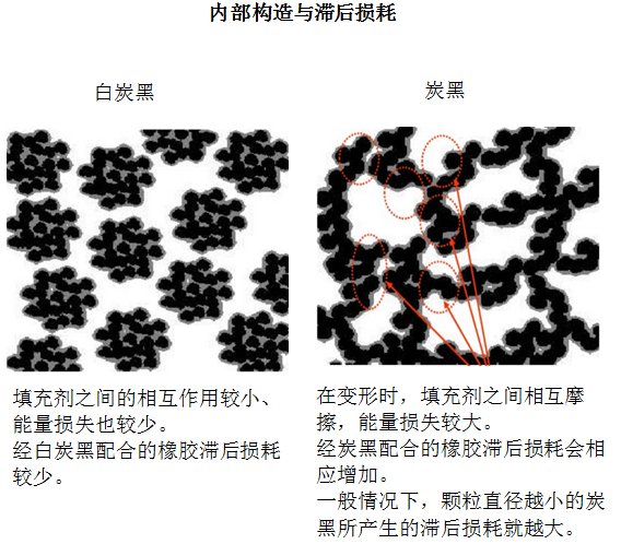 白炭黑凝聚體間的摩擦小,能量損失減少,滾動阻力降低;白炭黑施加的拘束小、橡膠能自由運動,橡膠彈性大、易吸收路面的變形,在與路面之間、易生成溶解橡膠,體現出高抓地力。對于炭黑來講,凝聚體大、摩擦大,橡膠對炭黑有較大的拘束。