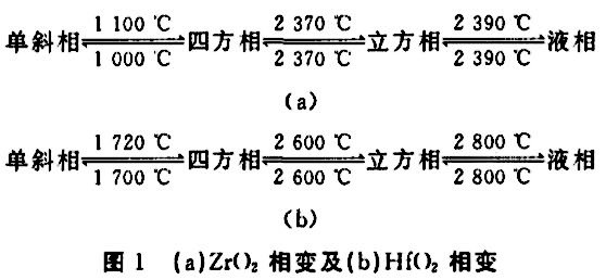 關于相變增韌的研究主要是圍繞ZrO2的相變特性展開的,是通過控制燒結工藝使內部的微觀組織產生增韌相,消耗裂紋擴展所需能量的同時造成相變體積膨脹促使其它裂紋閉合,是一種自增韌過程。以ZrO2和HfO2為例,隨溫度變化會發生以下同素異構轉變: