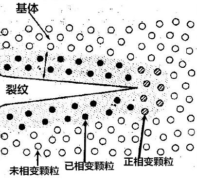 單斜相ZrO2增韌Al2O3陶瓷和TiB2增韌SiC陶瓷是典型的微裂紋增韌,微裂紋的形成將起到分散裂紋尖端能量的作用,增加了擴展過程中的表面能,從而使裂紋快速擴展受到阻礙,增加材料韌性。這就是微裂紋增韌,其原理如圖2所示。