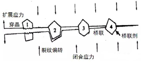 復合材料中存在的微裂紋也會導致主裂紋在擴展過程中發生偏轉,增加復合材料的韌性,其原理如(圖3,5)所示;裂紋橋聯可能發生穿晶破壞,也有可能出現裂紋繞過橋聯單元沿晶發展及偏轉的情況,其原理如(圖5)所示。