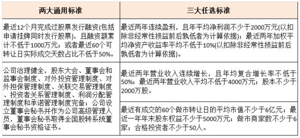 根據《新三板分層管理辦法》,入選創(chuàng)新層有兩大通用標準和三大任選標準。在滿足兩大通用標準的基礎上滿足任何一個任選標準即有望進入創(chuàng)新層,其余則進入基礎層。