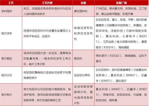 表1 鋰電池生產工藝及設備介紹