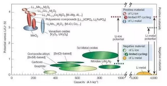 鋰電正負極材料體系非常豐富(圖2),目前,鈷酸鋰、錳酸鋰、磷酸鐵鋰、鎳鈷錳鋰等正極材料研究已趨于成熟。鈷酸鋰材料比容量有200-210 mA·h/g,其材料真密度和極片壓實密度均是現有正極材料中最高的,商用鈷酸鋰/石墨體系的充電電壓可提升4.40 V,已經可滿足智能手機和平板電腦對高體積能量密度軟包電池的需求。
