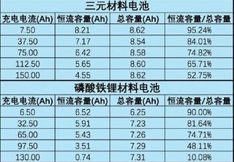 從表中可以看出,三元鋰電池與磷酸鐵鋰電池在10C以下充電時,恒流比無明顯差距,10C以上倍率充電時,磷酸鐵鋰電池恒流比例迅速降低,充電效率迅速降低。