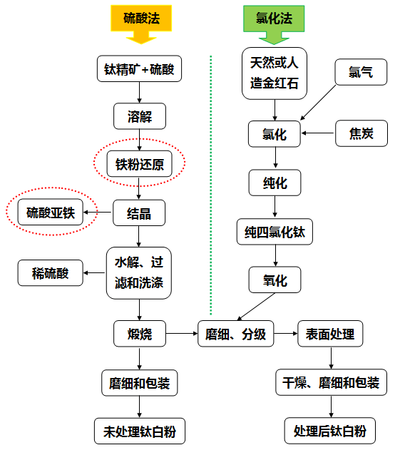 根據公開數據統計,2016年收官價格為15300元/噸,而在年初價格僅為10900元/噸,年漲幅高達40.36%,每噸上漲近5000元。而2017年的鈦白粉依然坐在了漲價的風口,價格不斷攀升且絲毫沒有回轉之意。查閱資料可知,鈦白粉生產方法主要有硫酸法和氯化法,具體流程如下: