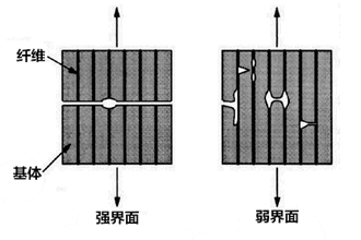 強的界面粘結往往導致脆性破壞,裂紋在復合材料的任一部位形成并迅速擴散至復合材料的橫截面,導致平面斷裂。這是由于纖維的彈性模量不是大大高于基體,因此在斷裂過程中,強界面結合不產生額外的能量消耗。