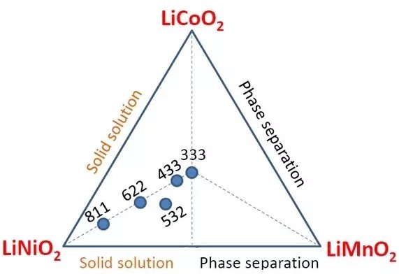 因為Co和Ni具有相似的電子構型,相似的化學性質,離子尺寸差異也很小,鎳酸鋰和鈷酸鋰可以發生等價置換形成連續固溶體并保持層狀的α-NaFeO2結構,為了得到更加穩定的高鎳固溶體材料,除了加入鈷以外,添加Al可以進一步提高材料的穩定性和安全性,這樣就形成了鎳鈷鋁酸鋰三元材料。