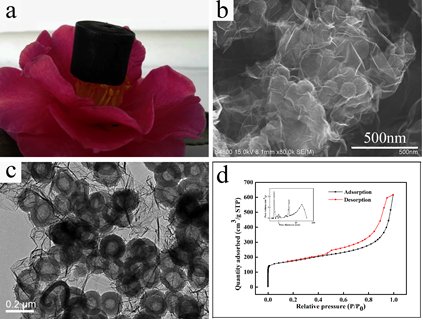 圖2 石墨烯交聯的碳空心球氣凝膠:(a)花瓣上的氣凝膠;(b)氣凝膠的掃描電子顯微鏡照片;(c)氣凝膠的透射電子顯微鏡照片;(d)氣凝膠的氮氣吸脫附曲線。