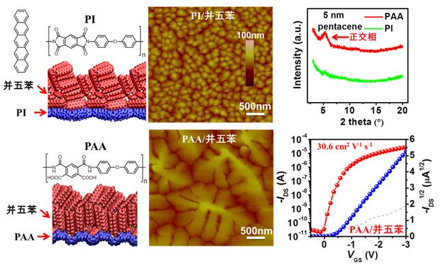 最近研究人員發現聚酰亞胺PI的熱前驅體聚酰胺酸PAA薄膜表面強極性和納米溝槽結構能選擇性誘導并五苯分子站立生長,聚集形成有利于電荷傳輸的正交相,并且能進一步形成尺寸大、晶界少的高晶態薄膜,遷移率高達30.6 cm2 V-1 s-1,是迄今為止并五苯薄膜器件的最高值,也是有機半導體最高遷移率的少數例子之一。進一步發現PAA能誘導結晶度更高的并四苯、酞菁銅等有機半導體晶態膜的生長,驗證了表面納米溝槽誘導作用的普適性,為構筑高性能的有機半導體器件提供一種新的思路和方法(J. Am. Chem. Soc. 2017, 139, 2734)。