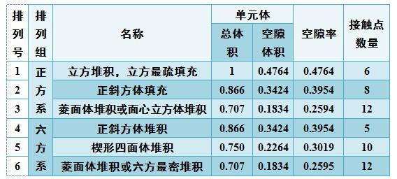 表1匯總了它們的空間特征的計算結果。若將排列2回轉90°,則成為排列4,排列3回轉125°16'則成為排列6,其空間特性相同。排列1和4是最疏填充,排列3和6是最密填充。