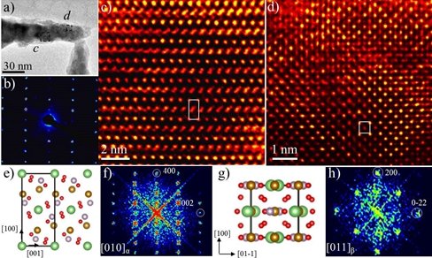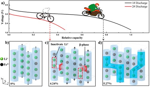 北京大學深圳研究生院新材料學院潘鋒教授課題組最近在LiMn1-xFexPO4材料的結構與性能研究取得重要進展。他們成功合成了兩種高鐵鋰反位量的α-LiMn1-xFexPO4納米材料(50納米的顆粒),相近的反位程度卻表現出了極大的電化學性能差異。通過和布魯克海文國家實驗室、德國于利希國家實驗室、美國阿貢國家實驗室等合作,課題組對兩種材料的結構進行了深入分析,用高精度球差電子顯微鏡首次發現磷酸鐵錳鋰的第二相β-LiMn1-xFexPO4以量子點(2納米左右)嵌在α-LiMn1-xFexPO4 50納米顆粒中。研究發現性能好的材料其鐵鋰反位量高,產生了許多的缺陷位置,因為這些缺陷點打通了相鄰的其他方向的傳輸,使得鋰離子的傳輸從一維鋰離子通道傳輸擴展成為三維通道傳輸,從而提高了該鋰電池材料的充放電性能。如果α-LiMn1-xFexPO4材料存在第二相β-LiMn1-xFexPO4以量子點嵌入形成套嵌結構的納米材料后,嵌入量子點將堵塞部分鋰離子的三維通道傳輸,從而降低了鋰離子在整個晶體的傳輸效率,影響了該鋰電池材料的充放性能。