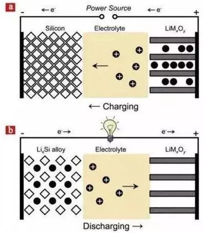 硅是目前已知的比容量最高的鋰離子負極材料,可以達到4200mAh/g,遠超石墨負極理論比容量372mAh/g十倍有余,然而其低的循環壽命嚴重阻礙了其商業化應用。具體充放電原理如下: