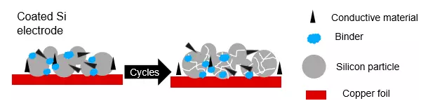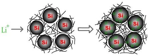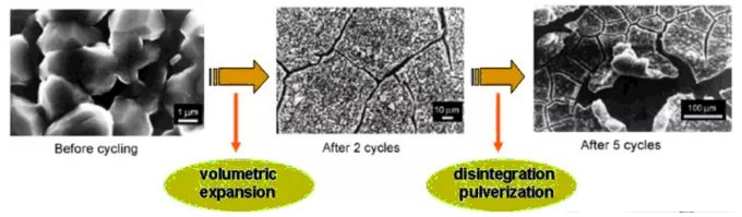 硅負極低的循環壽命源于其在充放電過程中存在巨大體積膨脹。充電時鋰離子從正極材料脫出嵌入硅晶體內部晶格間,造成了很大的膨脹(可達300%,石墨僅為10%),形成硅鋰合金;而放電時鋰離子從晶格間脫出,又形成了很大的間隙。這種現象將導致如下結果: