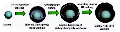 蛋黃-殼結構是在核殼結構基礎上,在內核與外殼間引入空隙部分,進而形成的一種新型納米多相復合材料。它的空腔對于硅體積膨脹有容納作用,可實現硅核更加自由的膨脹收縮。