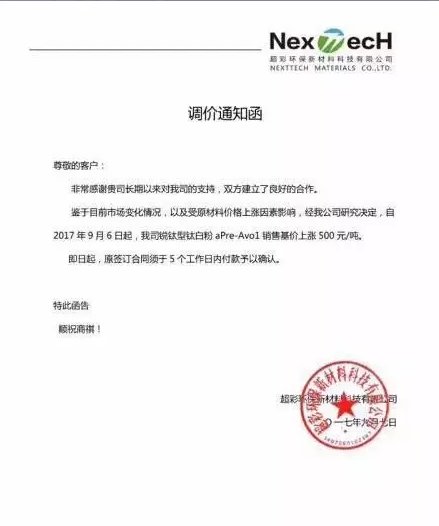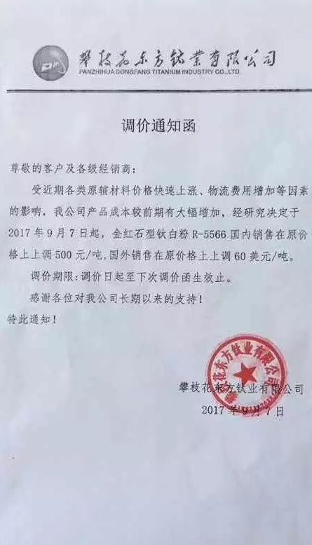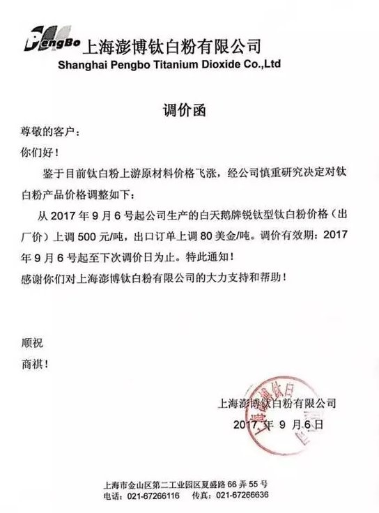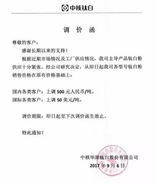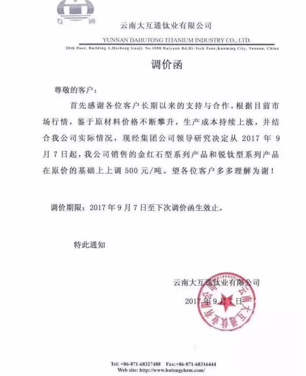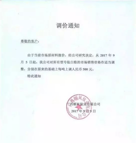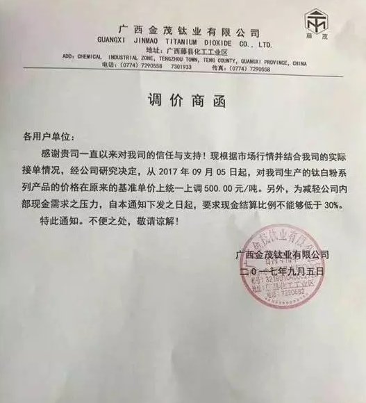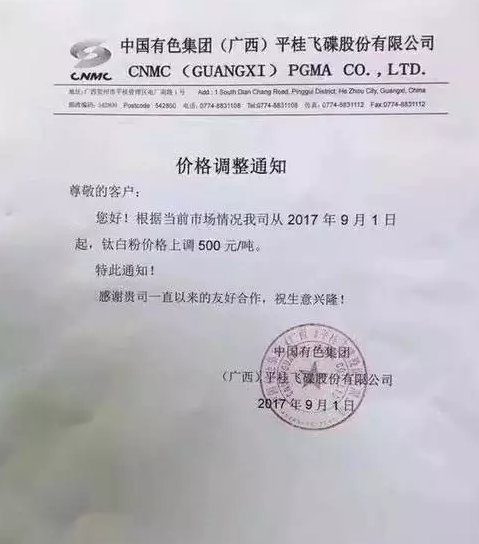 中國的粉體網訊 近日國外內鈦白粉企業紛紛漲價(漲價函),其中龍蟒佰利再次發布漲價通知,此輪漲價已是年內的第七次調價。國際巨頭科慕公司也發出鈦白粉提價公告。公告中稱,自10月1日起,科慕旗下所有規格的Ti-Pure™鈦白粉價格在中國大陸原有的基礎上上調150美元/噸(合計975元/噸)。