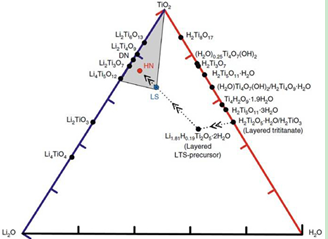 圖1 Li2O-TiO2-H2O三元相圖及鈦酸鋰水合物的合成路線圖